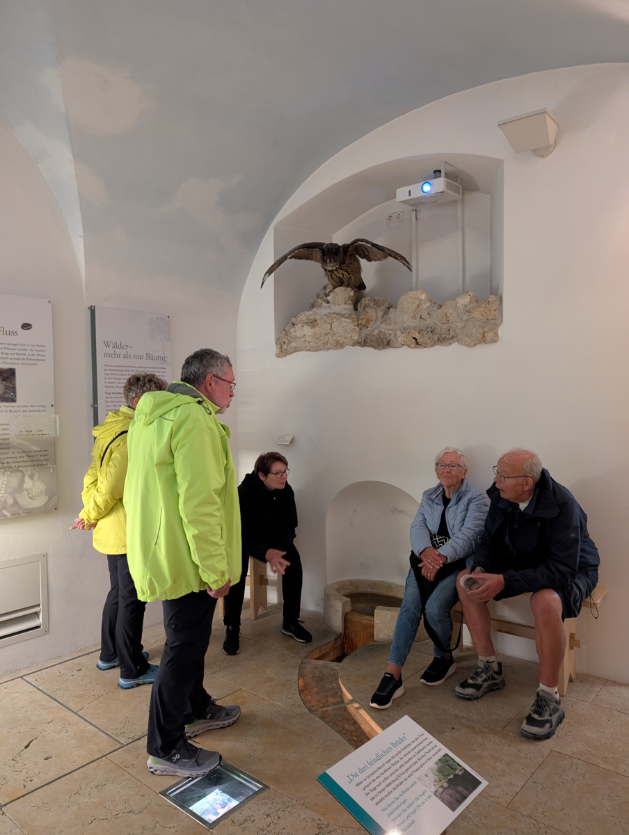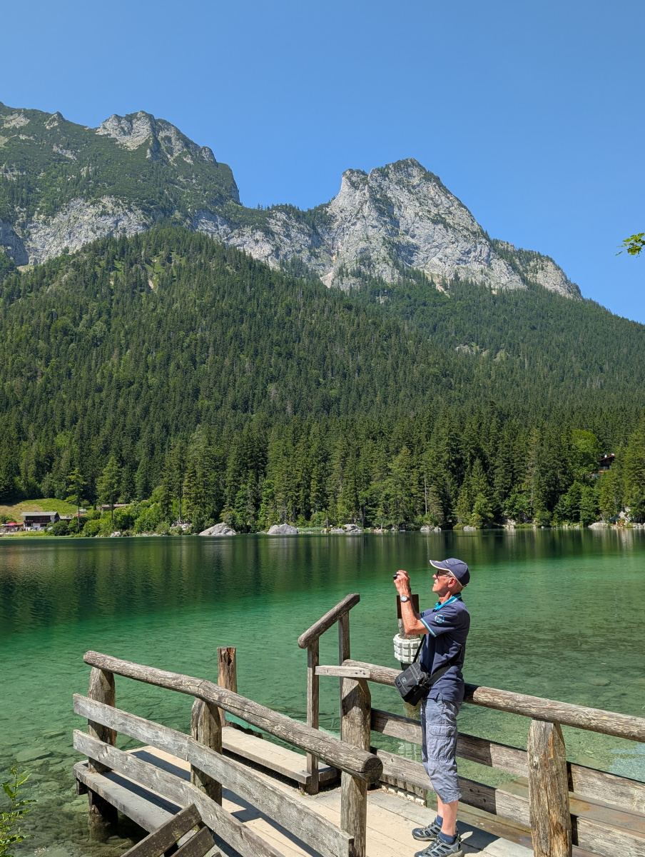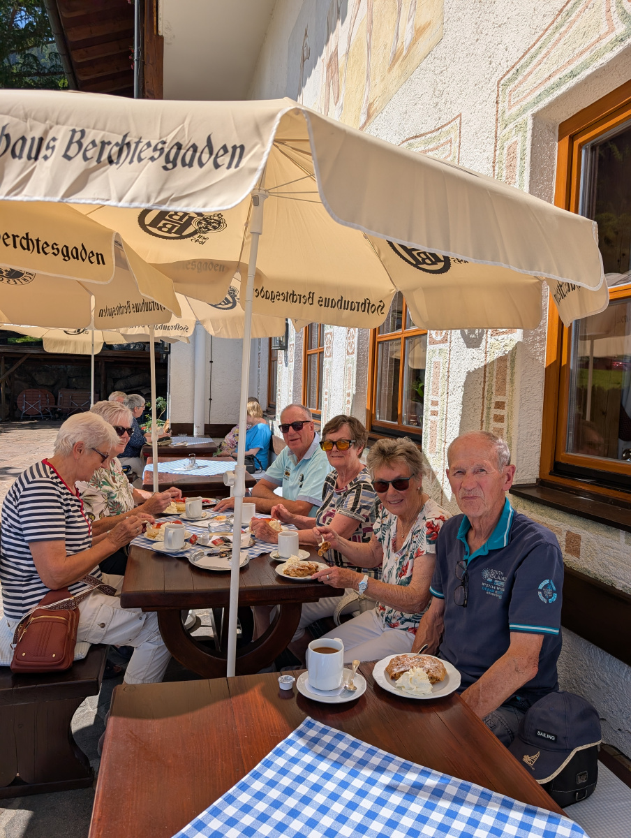 Sonntagmorgen wartete vor dem Hotel schon Dieter Horn, unser kundiger Reiseleiter. Er lotste uns zunächst nach Bad Reichenhall, wo wir das imposante Gradierwerk und die elegante Wandelhalle bestaunten; die salzhaltige Luft tat nach der langen Busfahrt richtig gut. Weiter ging es nach Berchtesgaden: Dieter erzählte lebhaft von Salzbergbau, Wittelsbacher Herrschaft und alpiner Architektur, während wir durch verwinkelte Gassen streiften. Nach einer Weißwurstpause bestiegen wir wieder den Bus Richtung Ramsau. Dort schossen wir das obligatorische Foto von der Pfarrkirche St. Sebastian vor gewaltiger Bergkulisse, wanderten anschließend in den Zauberwald und umrundeten teils den glasklaren Hintersee. Kaffee, Topfenstrudel und ein traumhafter Weitblick im Gasthaus Nutzkaser rundeten den Tag ab.