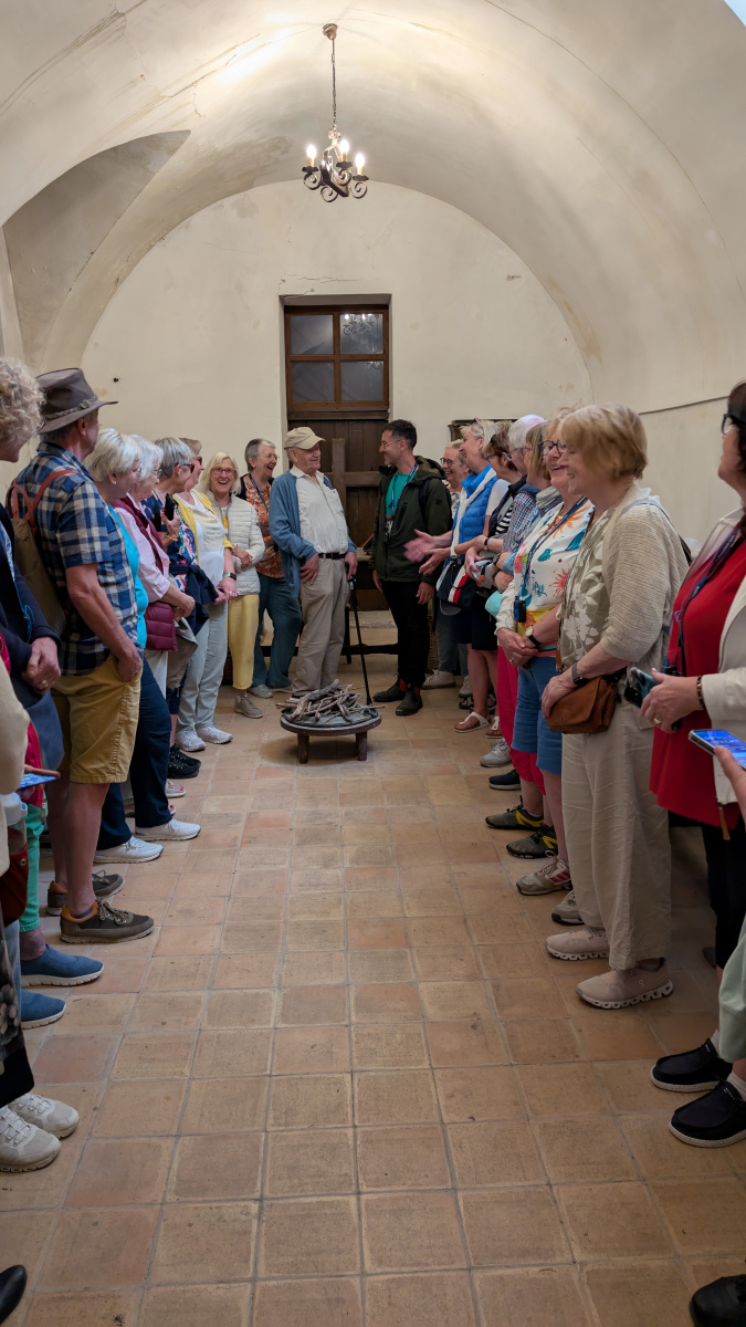 Der fünfte Tag führte uns tiefer in die Bergwelt der Sikaner. Unser erstes Ziel war die Einsiedelei der Heiligen Rosalia in Santo Stefano – ein spiritueller Ort inmitten eines duftenden Naturschutzgebietes. Schon am Vormittag genossen wir hier unseren ersten Wein. Weiter ging es nach Cammarata, dessen Traditionen rund um Pecorino und Ricotta legendär sind. In einer kleinen Käserei erlebten wir hautnah, wie die würzigen Käsesorten entstehen, und verkosteten mit großem Appetit. Am Abend verwöhnte uns Casale Margherita mit einem üppigen Menü aus lokalen Spezialitäten. Bis auf das Gericht mit Kutteln – das einige von uns skeptisch beäugten – war alles köstlich und wird uns noch lange auf der Zunge nachklingen.