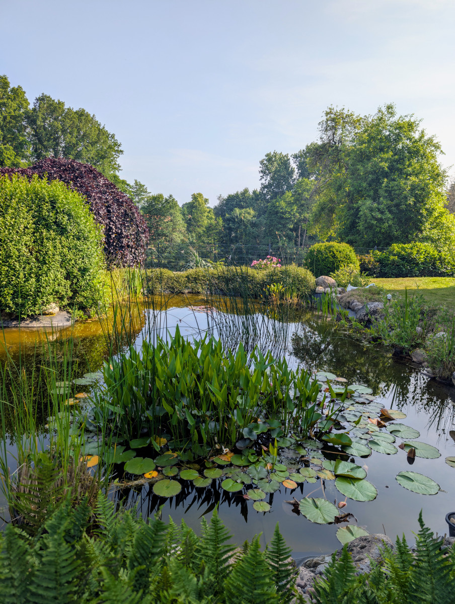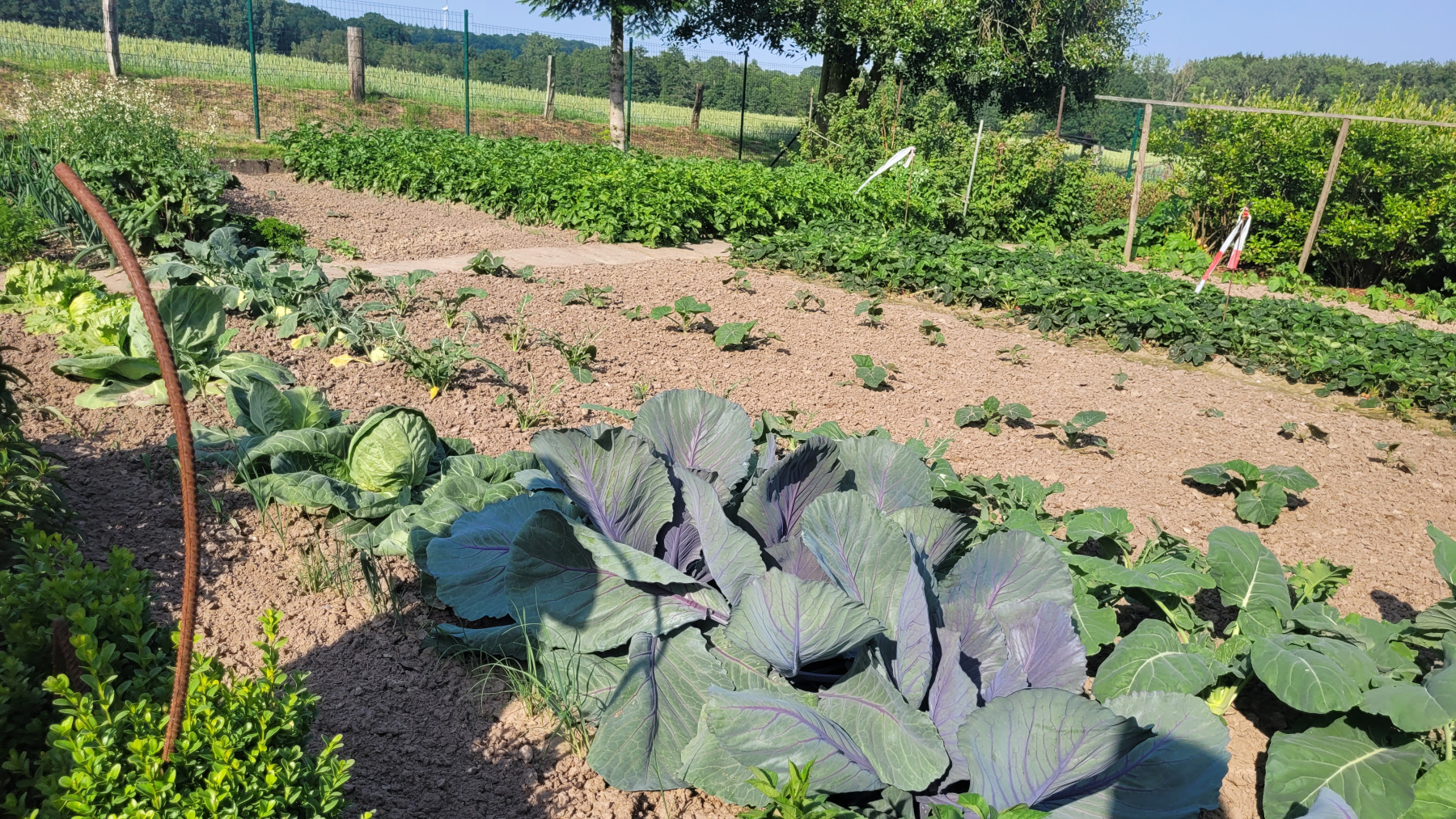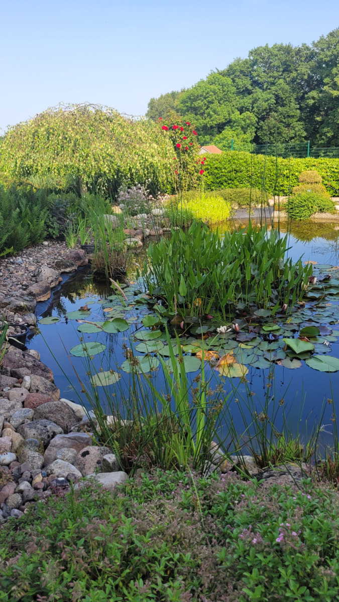 Der letzte Garten führte uns nach Neubruchhausen zu Brigitte Heineke. Die Einfahrt durch eine alte Baumallee eröffnete den Blick auf einen herrlich gelegenen landwirtschaftlichen Betrieb. Besonders beeindruckte uns der wunderschön angelegte Gartenteich mit Seerosen und weiteren Wasserpflanzen. Viele blühende Rosen säumten den Weg zu einem üppigen Gemüsegarten. Von Salaten und Bohnen über Kartoffeln und Kräuter bis hin zu Erdbeeren und weiteren Obstsorten – alles, was das Gärtnerherz begehrt, war hier zu finden.