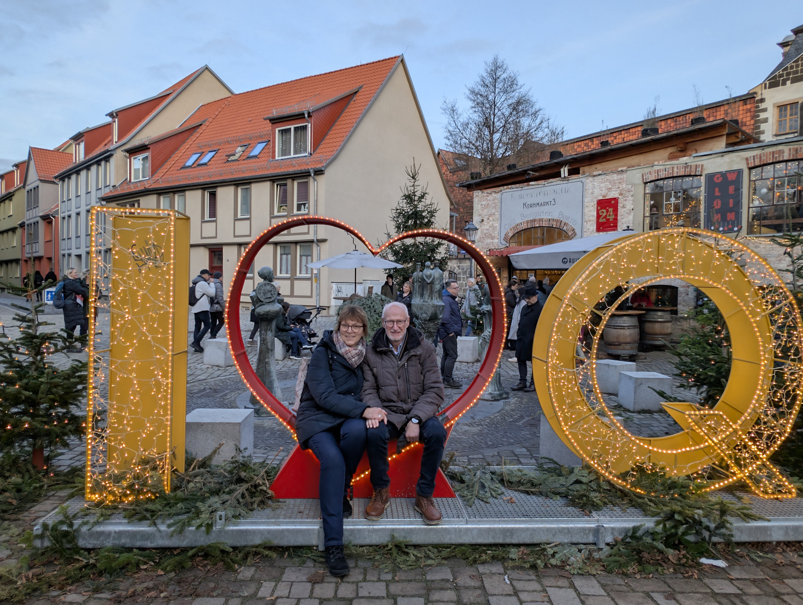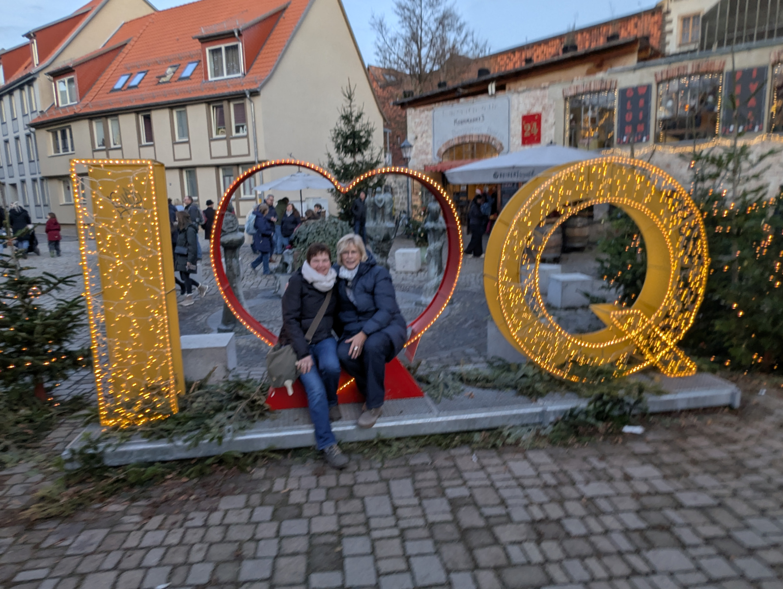 Unsere dreitägige Reise zu den Weihnachtsmärkten war ein unvergessliches Erlebnis. Mit 86 Frauen und Männern in zwei Bussen machten wir uns auf den Weg nach Erfurt. Am ersten Tag erkundeten wir den festlichen Weihnachtsmarkt, der mit seinen vielen Ständen und Lichtern eine zauberhafte Atmosphäre bot. In kleinen Gruppen schlenderten wir über den Markt und genossen die Leckereien. An vielen verschiedenen Ecken waren kleine Märkte aufgebaut. Auch einige Höfe hatten ihre Türen geöffnet.Der größerer Markt fand direkt vorm Erfurter Dom und der Severin Kirche statt.