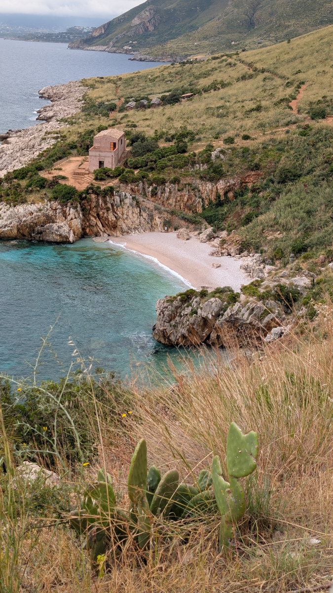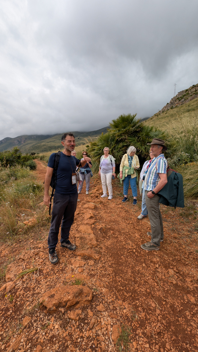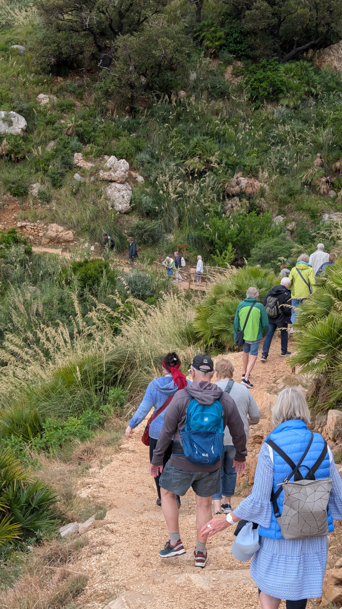 Frisch ausgeruht starteten wir am siebten Tag in den ältesten Naturpark Siziliens, den Zingaro. Auf steinigen Pfaden wanderten wir entlang schroffer Klippen, vorbei an versteckten Buchten mit türkisblauem Wasser. Wer wollte hätte einen Sprung ins Meer wagen können – ein erfrischendes Finale für unsere Trekkingrunde. Das Mittagessen genossen wir in San Vito lo Capo: Fisch-Couscous mit Blick auf die weite Bucht verband Aromen Afrikas und Siziliens. Weiter führte uns die Reise nach Erice, das hoch oben über Trapani thront. In den verwinkelten Gassen mit Ausblick auf die Salinen verkosteten wir die knusprigen Ericini-Plätzchen. An diesem Tag feierten wir mitten in der Altstadt den Geburtstag einer Mitreisenden – sie lud ein auf Cappuchino und Süßgebäck, und wir stießen glücklich an. Zurück im Landhaus Baglio Santa Croce ließen wir diesen Höhepunkt noch in aller Ruhe ausklingen.