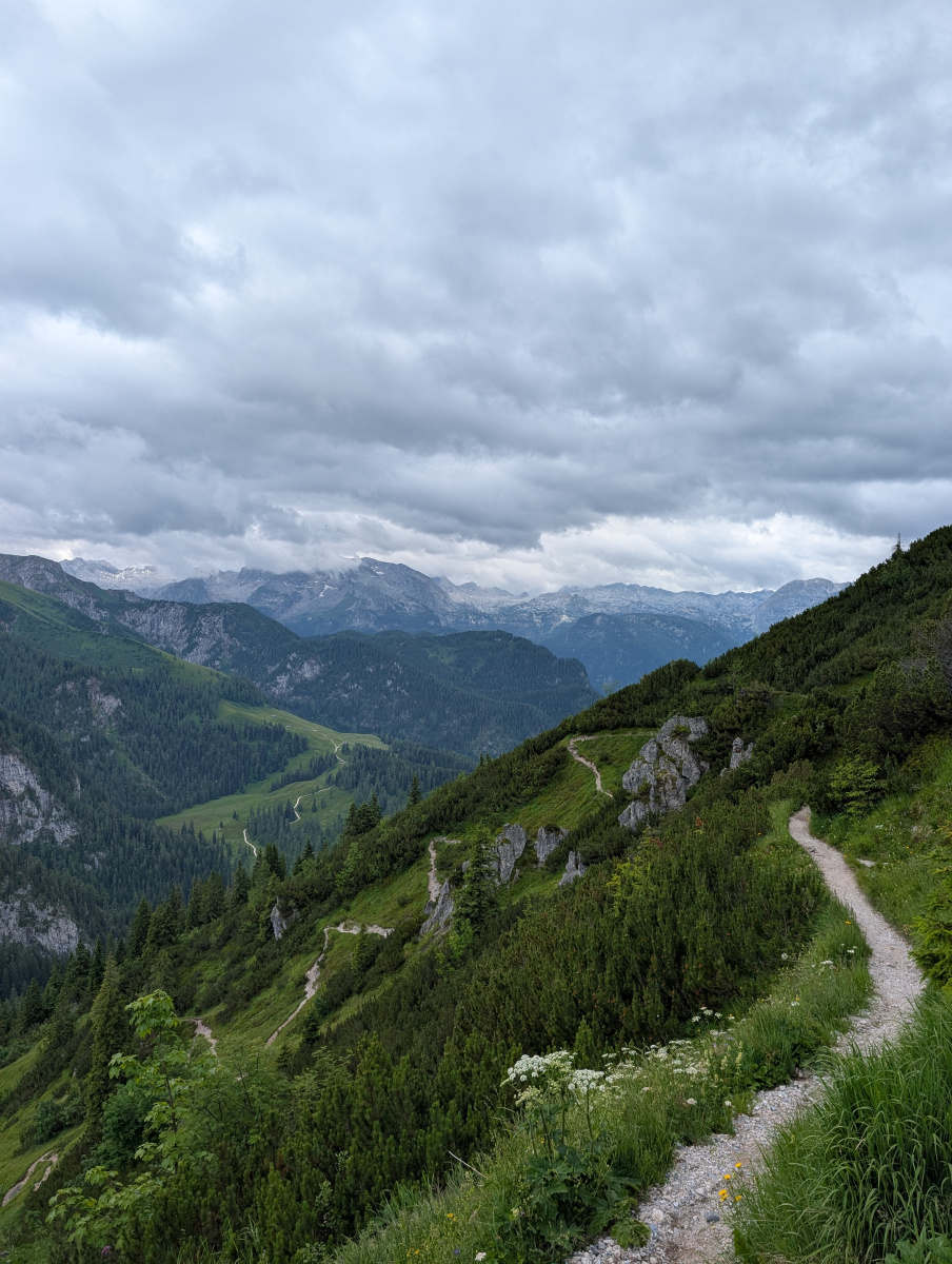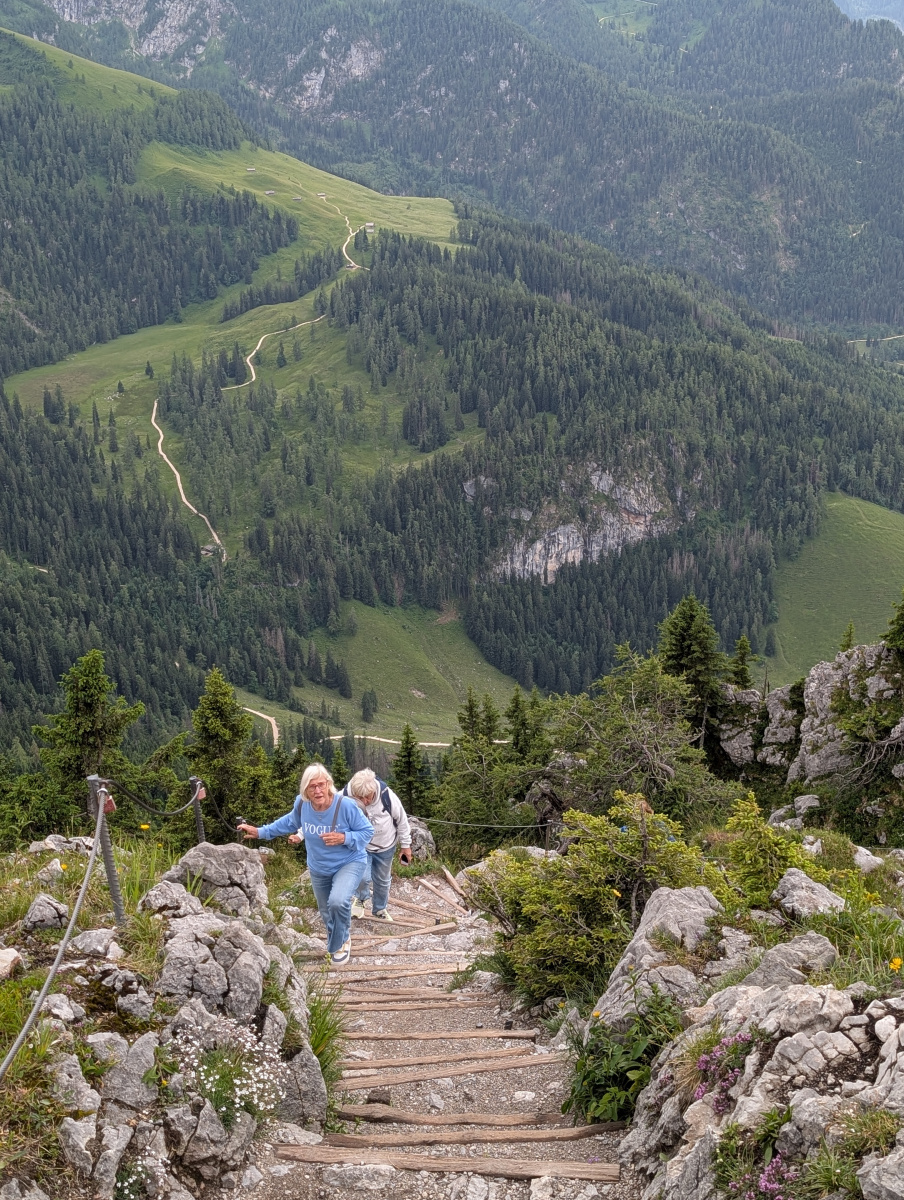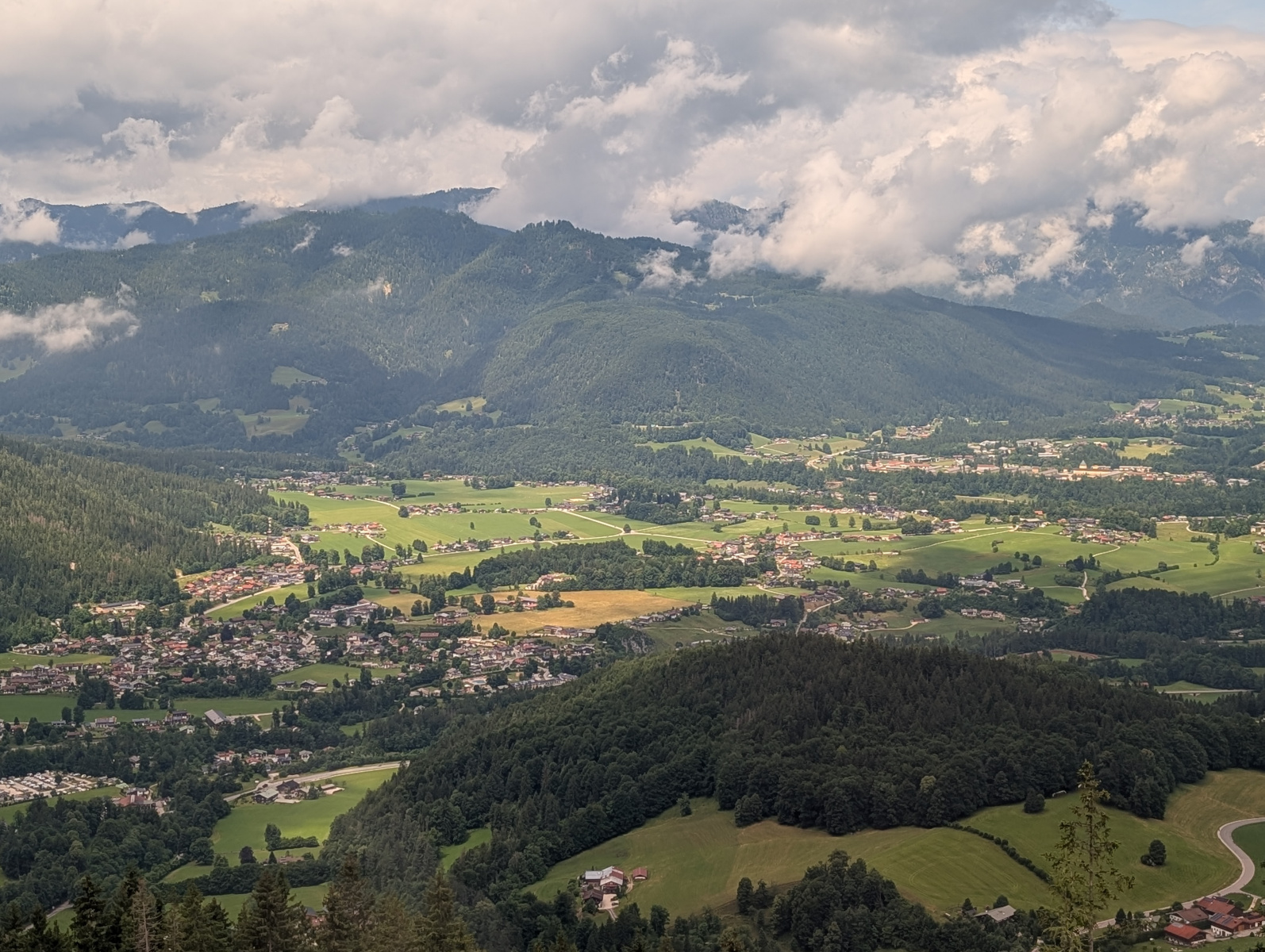 Sonntagmorgen wartete vor dem Hotel schon Dieter Horn, unser kundiger Reiseleiter. Er lotste uns zunächst nach Bad Reichenhall, wo wir das imposante Gradierwerk und die elegante Wandelhalle bestaunten; die salzhaltige Luft tat nach der langen Busfahrt richtig gut. Weiter ging es nach Berchtesgaden: Dieter erzählte lebhaft von Salzbergbau, Wittelsbacher Herrschaft und alpiner Architektur, während wir durch verwinkelte Gassen streiften. Nach einer Weißwurstpause bestiegen wir wieder den Bus Richtung Ramsau. Dort schossen wir das obligatorische Foto von der Pfarrkirche St. Sebastian vor gewaltiger Bergkulisse, wanderten anschließend in den Zauberwald und umrundeten teils den glasklaren Hintersee. Kaffee, Topfenstrudel und ein traumhafter Weitblick im Gasthaus Nutzkaser rundeten den Tag ab.