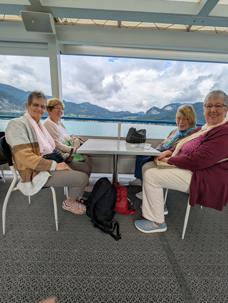 Vor der Abfahrt standen zwei Geburtstagsständchen an; unsere Akkordeonspielerin sorgte dabei für Stimmung. Über Prien setzten wir zur Herreninsel über und ließen uns im Palast Herrenchiemsee vom „Bayerischen Märchenkönig“ Ludwig II. verzaubern. Weiter ging es zur kleineren, stilleren Fraueninsel, deren Klosterkirche und Gärten idyllisch wirkten – bis ein heftiges Sommergewitter losbrach. Wir suchten Unterschlupf im Klosterladen, verkosteten selbstgemachten Klosterlikör und warteten geduldig. Kaum verzogen sich die Wolken, spazierten wir durch vom Regen glitzernde Gassen zurück zum Anleger. Die dramatische Stimmung sorgte für eindrucksvolle Erinnerungsfotos.